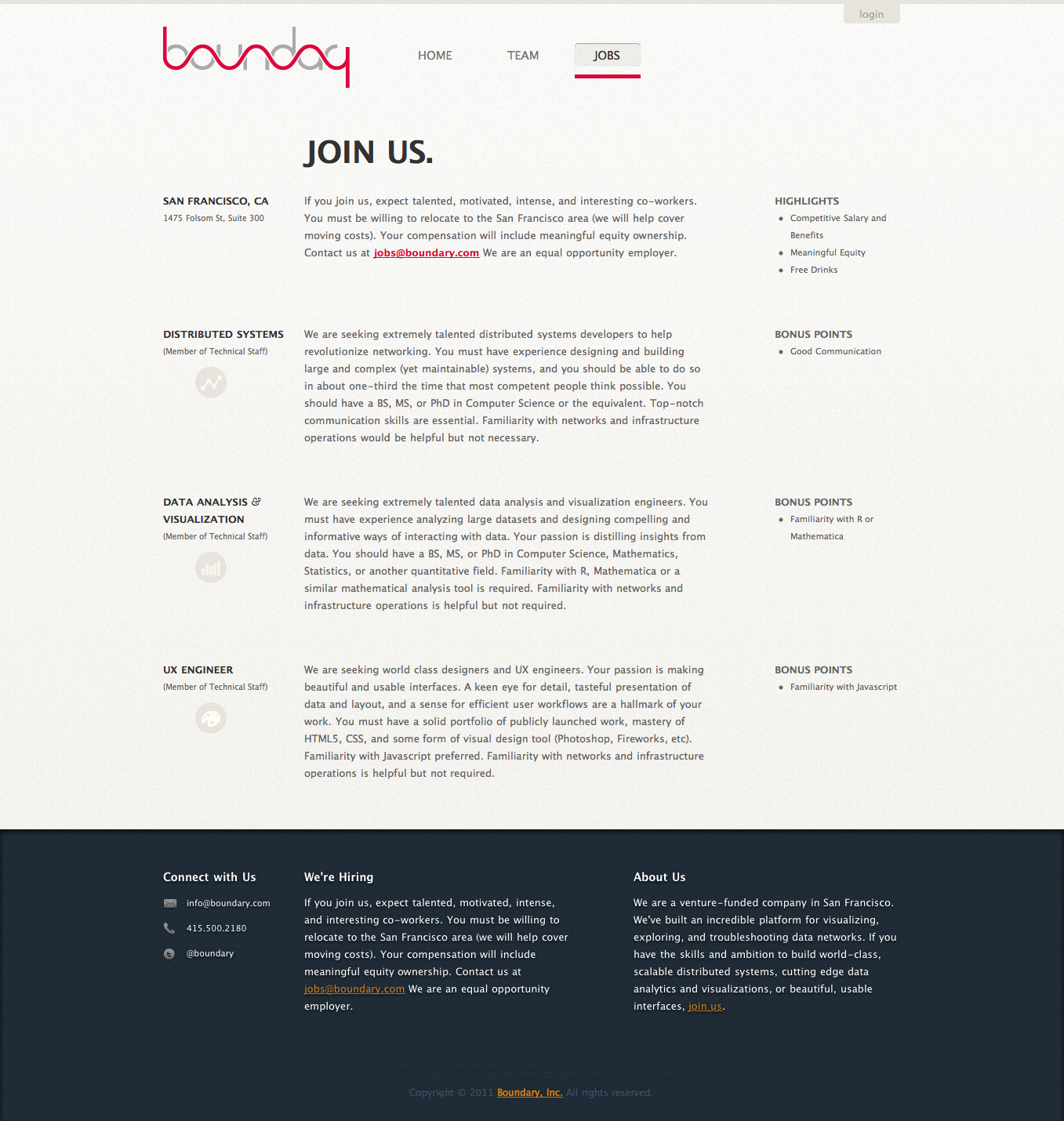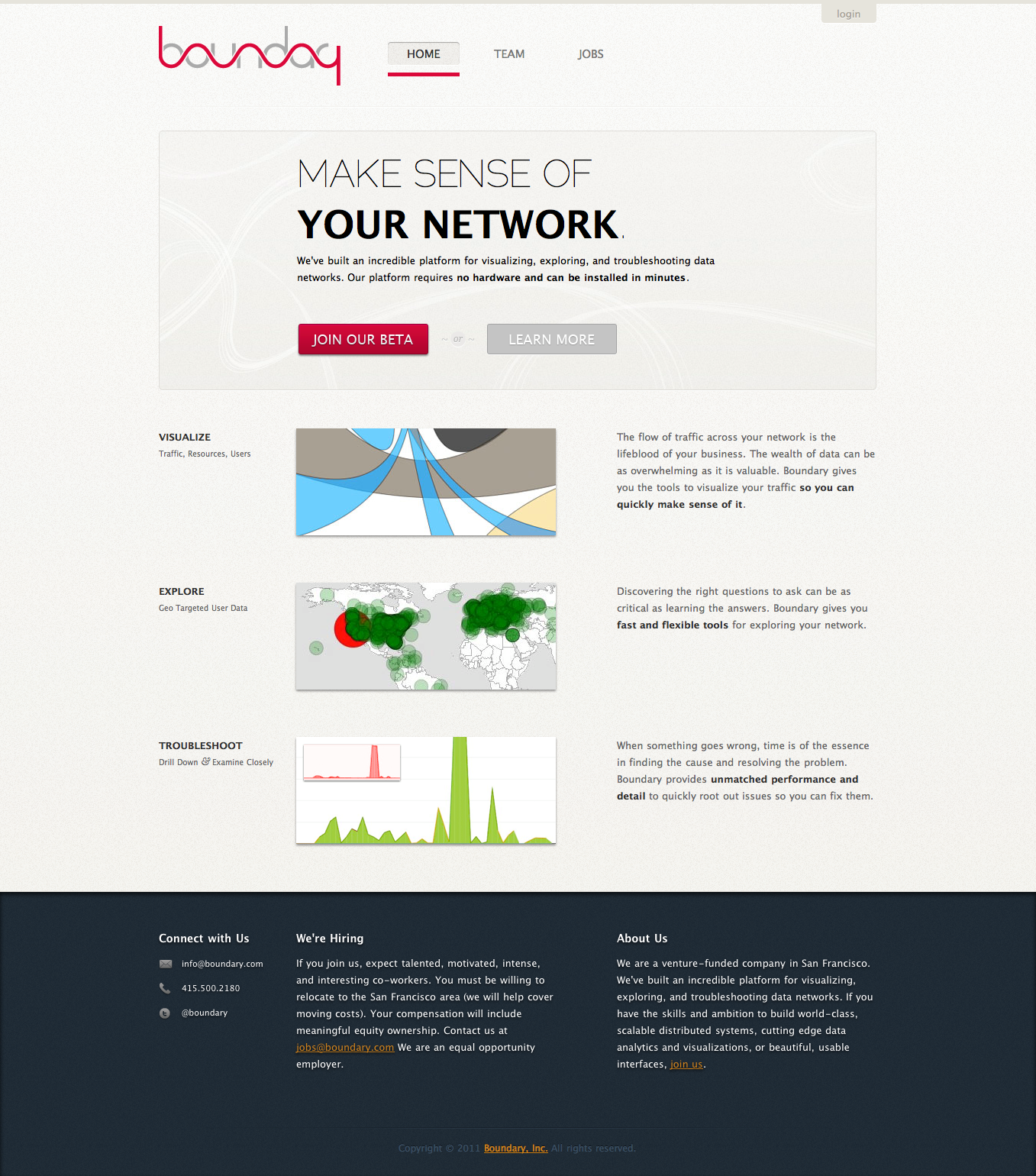 In early 2011, I served as a consultant to reimagine and redesign Boundary’s website. Working closely with the CEO, we developed a professional pre-launch website that played a crucial role in both fundraising and recruiting efforts.