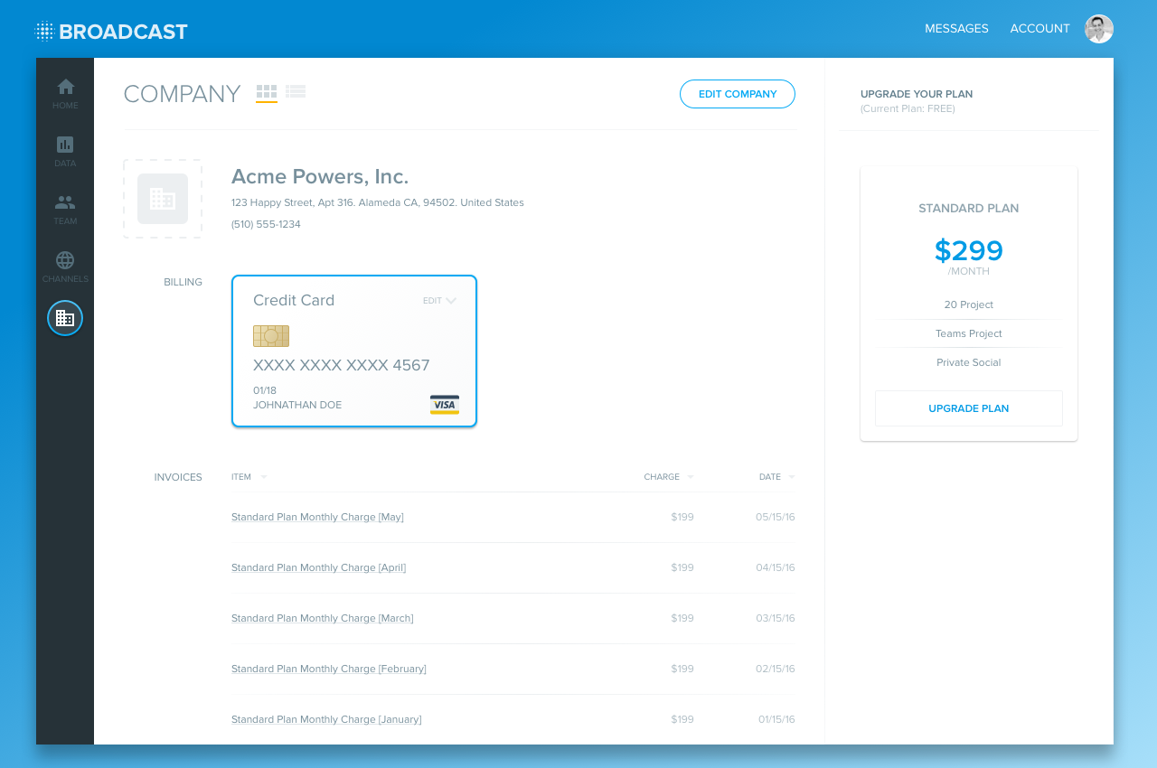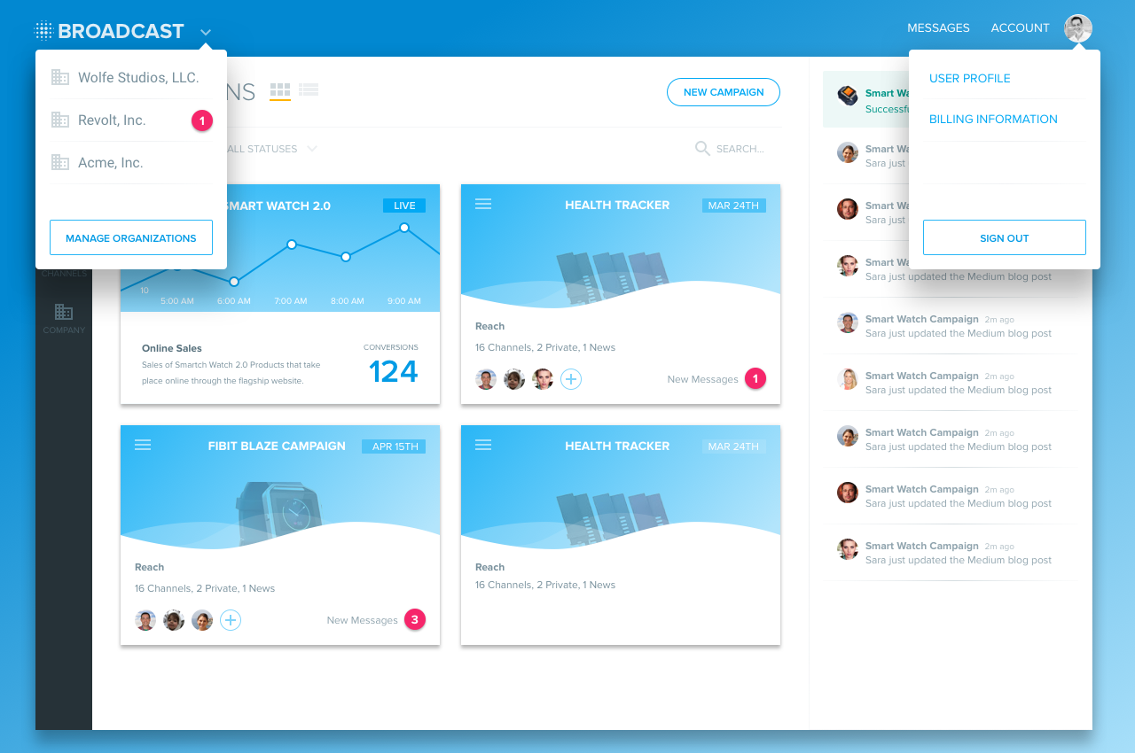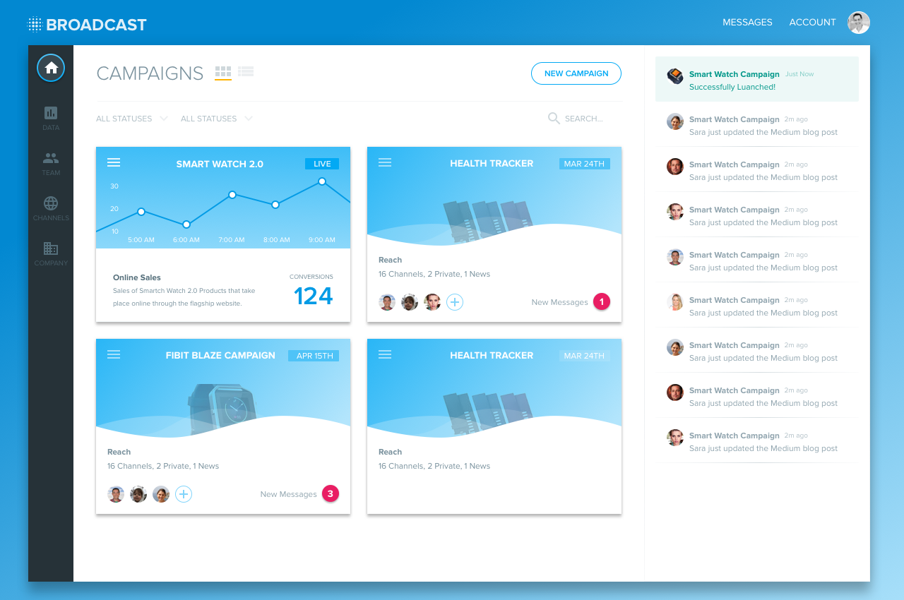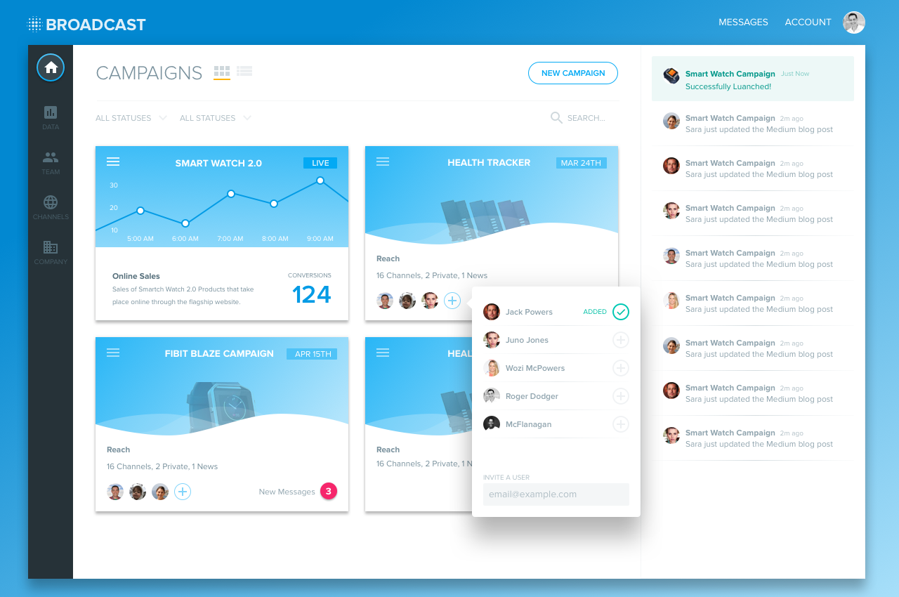 The final version of Broadcast was a streamlined product with simple and clear navigation. Removing campaigns allowed us to create a much flatter information architecture, with five primary sections that made using the product much more intuitive. We removed all extraneous features, making calls to action and user-generated content more prominent.