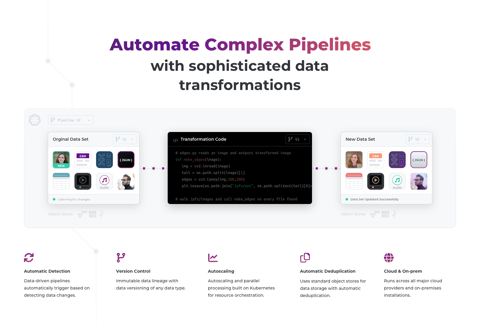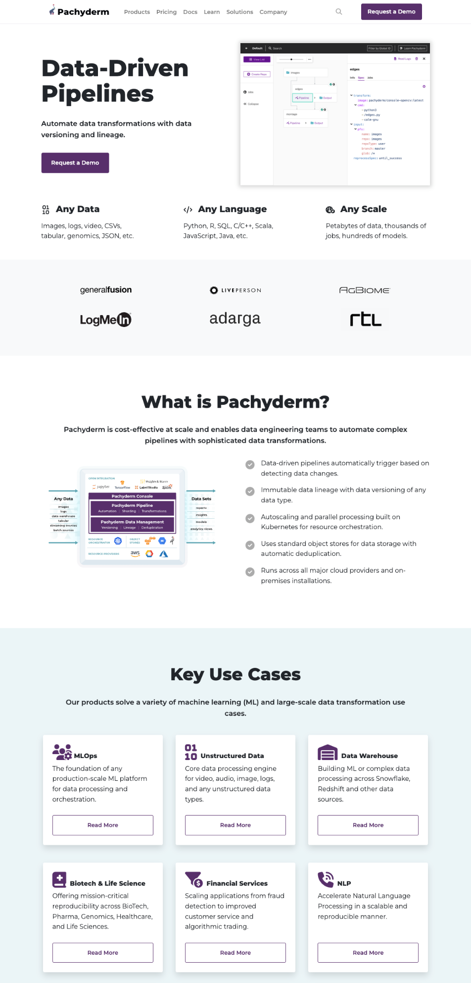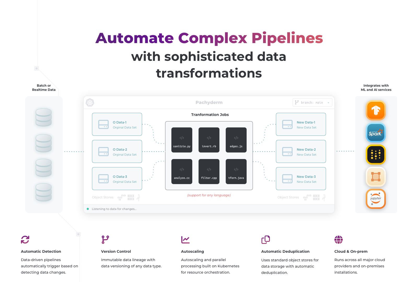 Pachyderm is a high tech startup that offers customers the ability to to import their data and transform it with an automated pipeline. Unlike other services, Pachyderm is data agnostic and works with any type of data (structured or unstructured).