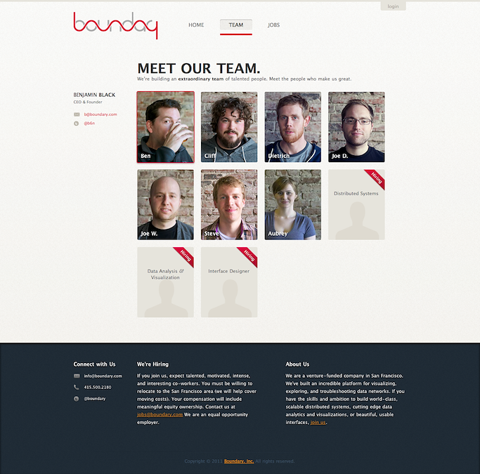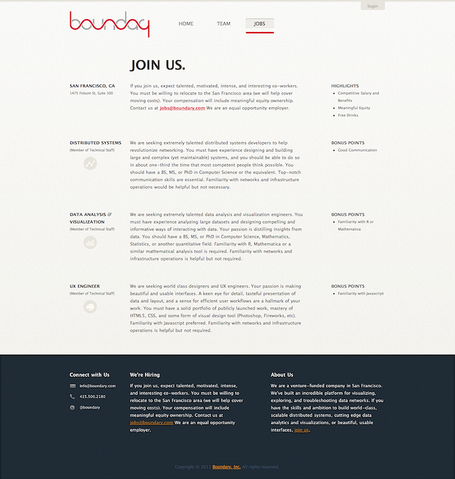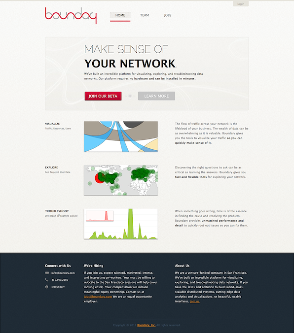 In early 2011, I served as a consultant to reimagine and redesign Boundary’s website. Working closely with the CEO, we developed a professional pre-launch website that played a crucial role in both fundraising and recruiting efforts.